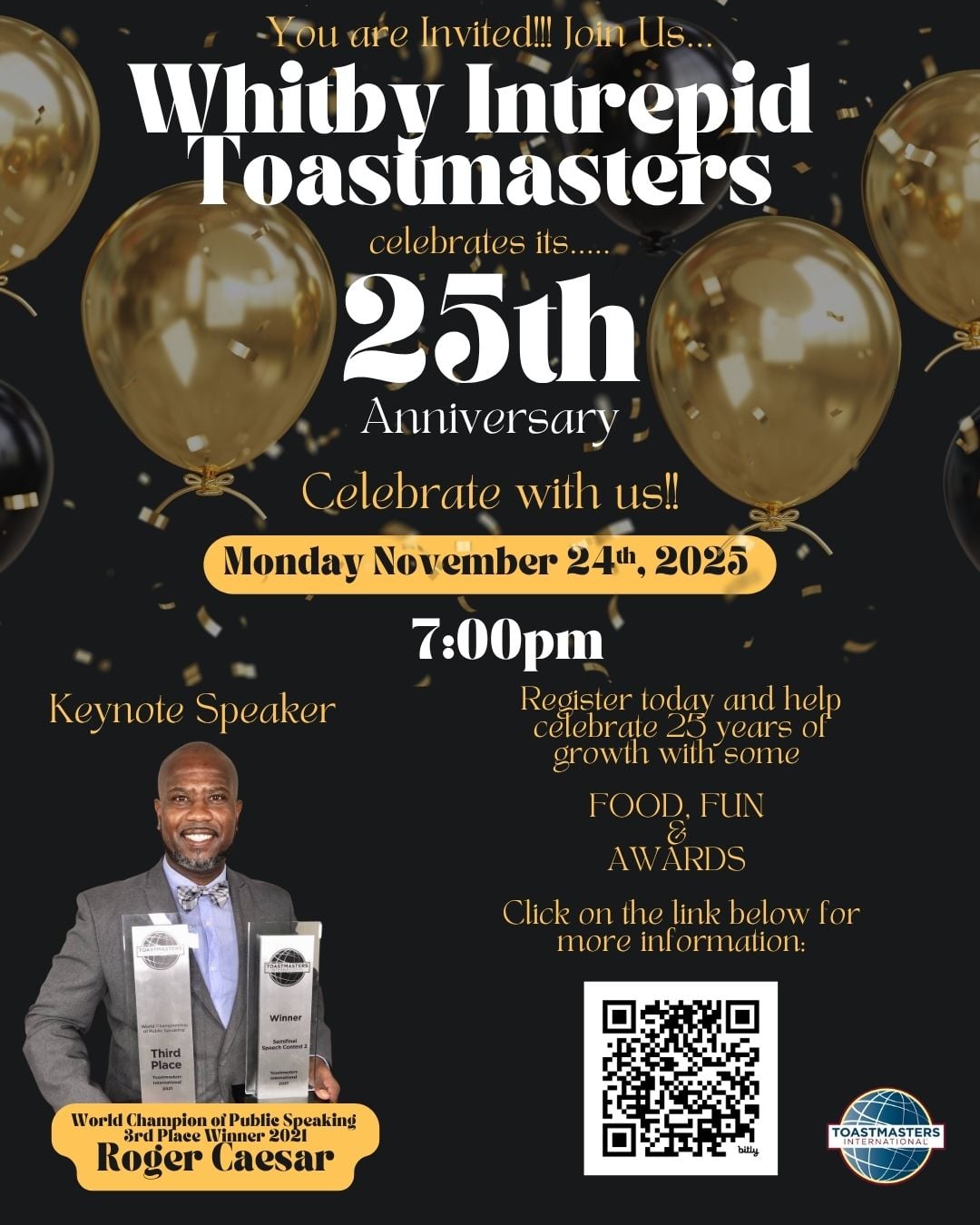 Whitby Intrepid is 25 years old and we are celebrating, our milestone with balloons, awards, food and a keynote speaker: Registration is free, however you are responsible for your own entree and drinks!! all information is on the attached flyer.