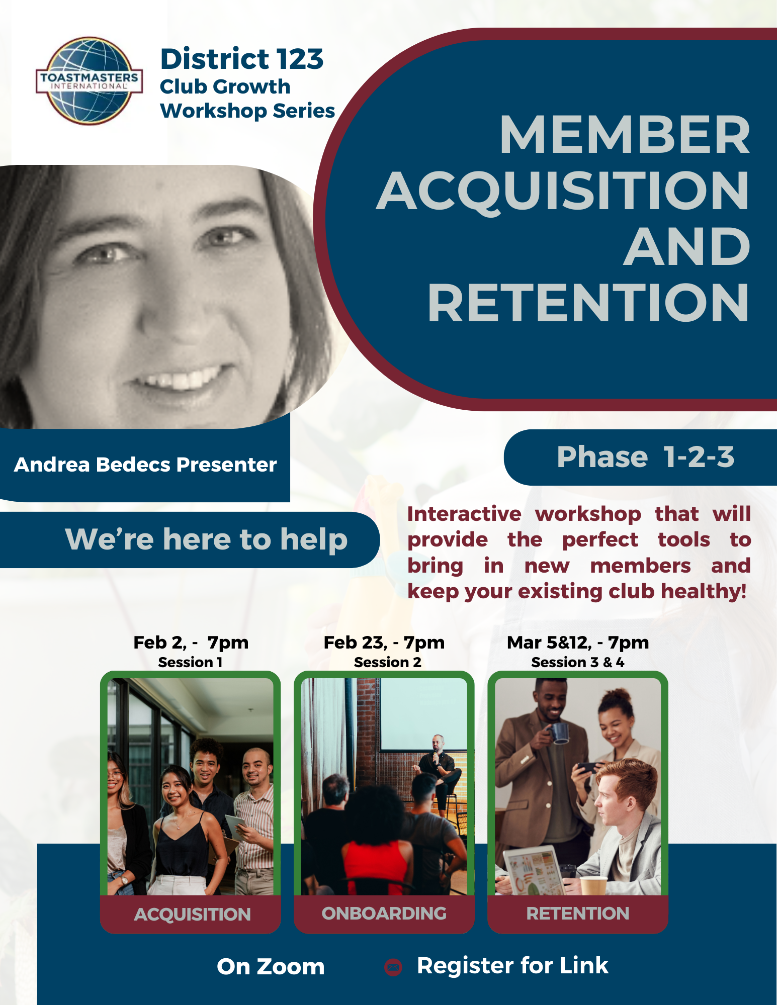 D123 Club Growth Directors Workshop Series Interactive workshop that will provide the perfect tools to bring in new members and keep your existing club healthy! Session 2 Onboarding Feb 23 Onboarding,  https://us06web.zoom.us/meeting/register/18j-vr7mSZ-YxSBoQElDDg